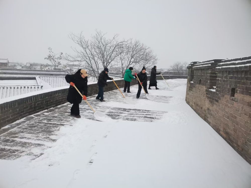 清晨6点,平遥古城的城墙上已是一番忙碌景象。全程6公里多的环线上,工作人员手持扫帚、铲子,正细心地清扫青砖上的积雪。