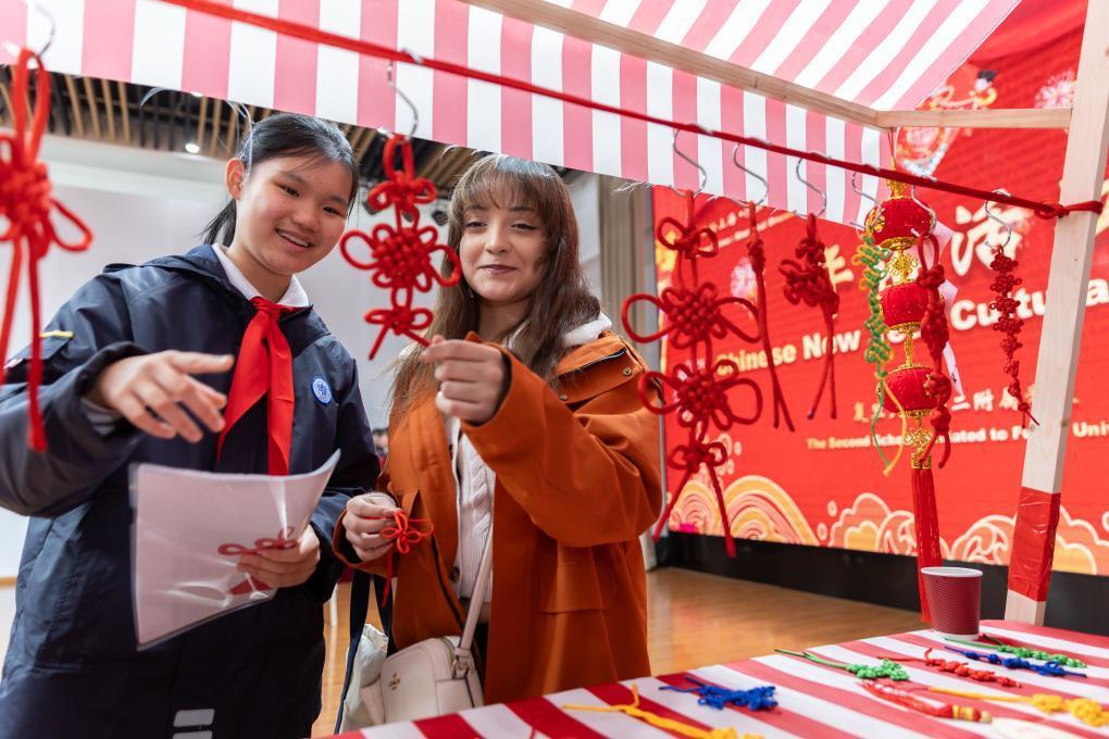 2024年1月28日,复旦大学第二附属学校学生(左)为美国马斯卡廷中学学生(右)介绍中国结。新华社记者 王翔 摄