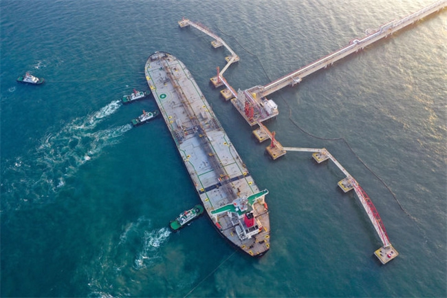 2025年12月18日,一艘装载着17.9万吨石化原辅料的船舶泊入国投洋浦油储码头30万吨级原油泊位(无人机照片)。新华社记者 郭程 摄