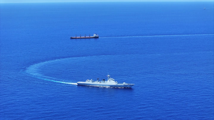 中国海军第46批护航编队焦作舰(下)护送货船至解护点后与之分航(2024年5月7日摄)。新华社发(张大禹 摄)