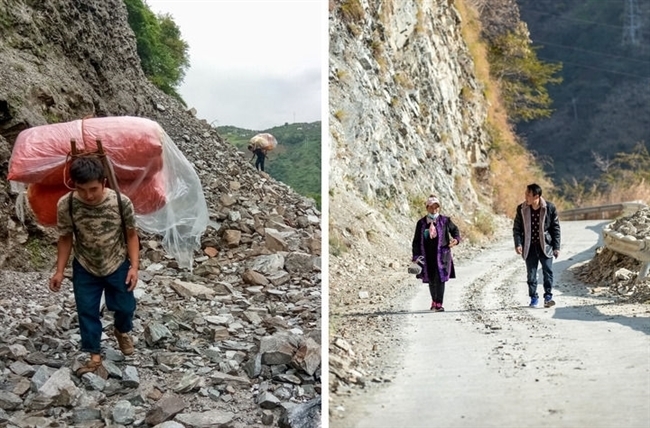 左图:四川凉山彝族自治州冕宁县里庄镇全阁村村民在硬化前的通村路上运送物资(冕宁县委宣传部提供);右图:出村公路硬化后,大大便利了村民及物资出行(新华社记者沈伯韩摄)