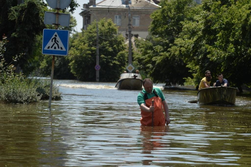 6月9日,一名水利工作人员在赫尔松市被洪水淹没的街道测量水位。卡霍夫卡水电站6日遭破坏导致水库大坝决堤,第聂伯河下游水位大幅上涨。图据新华社