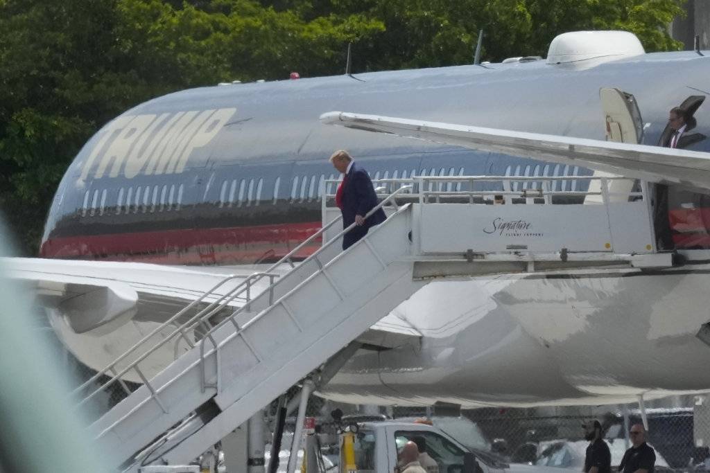 6月12日,美国前总统特朗普在迈阿密国际机场走下飞机,准备第二天就“密件风波”所涉37项联邦刑事指控出庭应诉。图据新华社/美联
