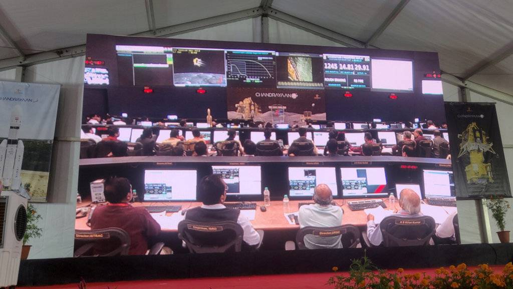 8月23日,在印度班加罗尔,一处大屏幕播放印度月球探测器相关直播画面。图据新华社