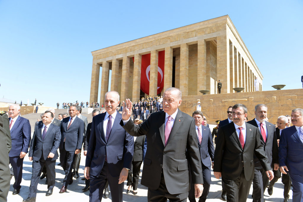 8月30日,在土耳其安卡拉,总统埃尔多安(中)出席“胜利日”庆祝活动。图据新华社