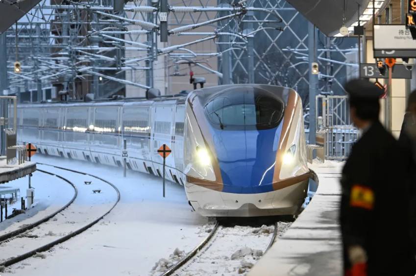 1月25日,一辆日本新干线列车抵达长野市长野车站。图据新华社/法新
