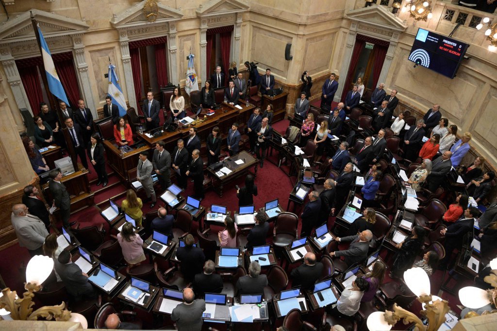 3月14日在阿根廷布宜诺斯艾利斯的国会大厦拍摄的参议院会议现场。阿根廷参议院14日投票否决了总统米莱签署的一项旨在放松经济管制的政令。图据新华社/法新