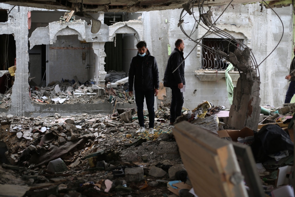 3月19日,在加沙地带南部城市拉法,人们查看以军轰炸后的建筑废墟。图据新华社