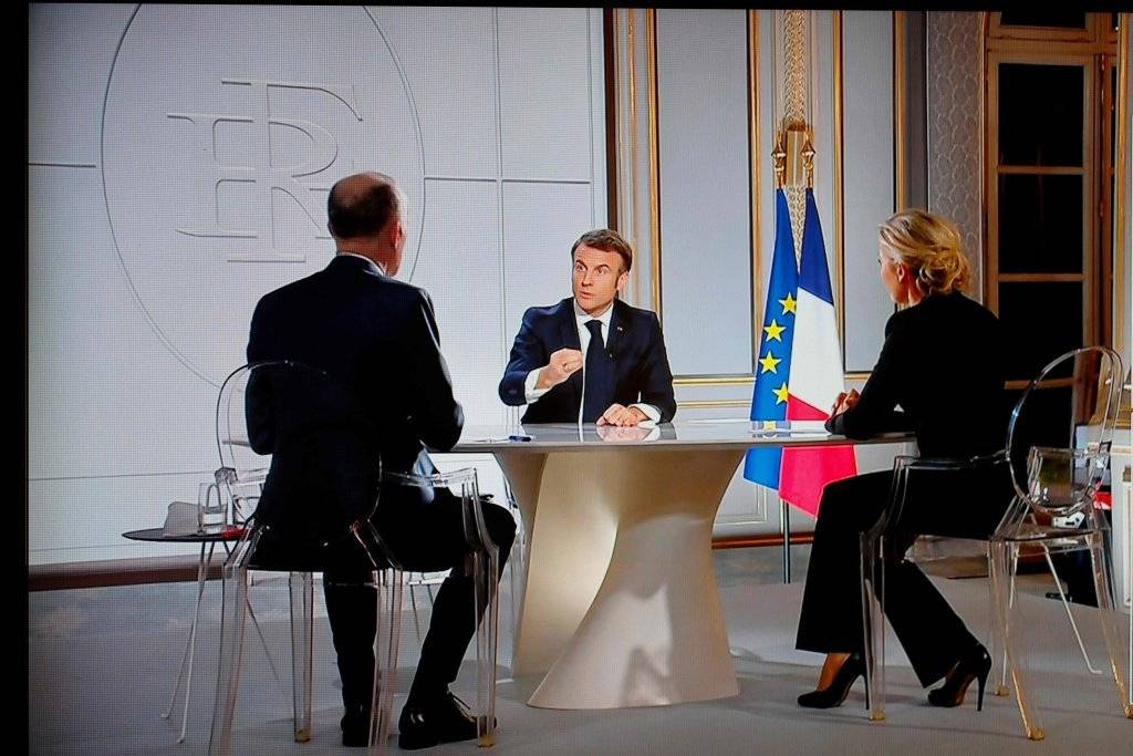 这张3月14日拍摄的电视屏幕显示,法国总统马克龙(中)在位于巴黎的总统府接受电视访谈。马克龙表示,支援乌克兰“不应事先设限”。图据新华社/法新