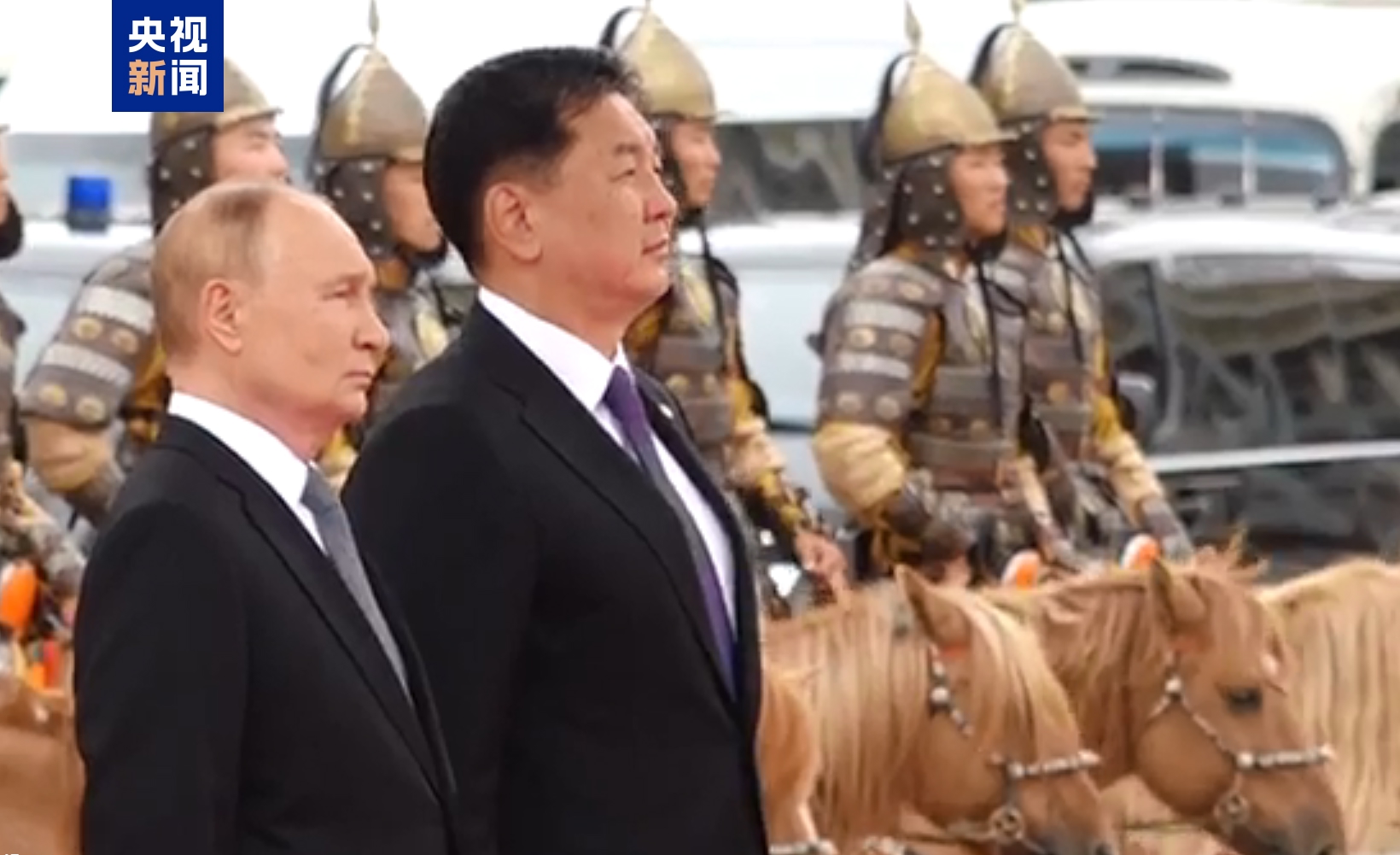 当地时间9月3日下午,蒙古国总统呼日勒苏赫在首都乌兰巴托市苏赫巴托广场举行仪式,欢迎俄罗斯总统普京正式访问蒙古国。