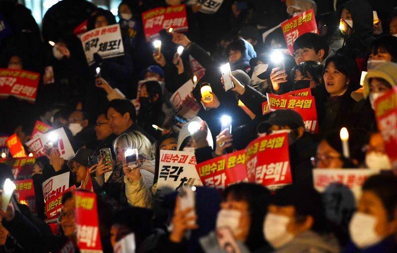 12月6日,韩国民众在位于首尔的韩国国会外集会要求总统尹锡悦下台。 新华社记者 姚琪琳 摄