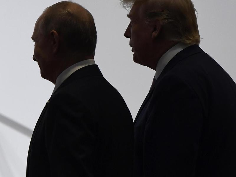 这是2019年6月28日在日本大阪拍摄的参加G20峰会的美国总统特朗普(右)和俄罗斯总统普京。新华社/美联
