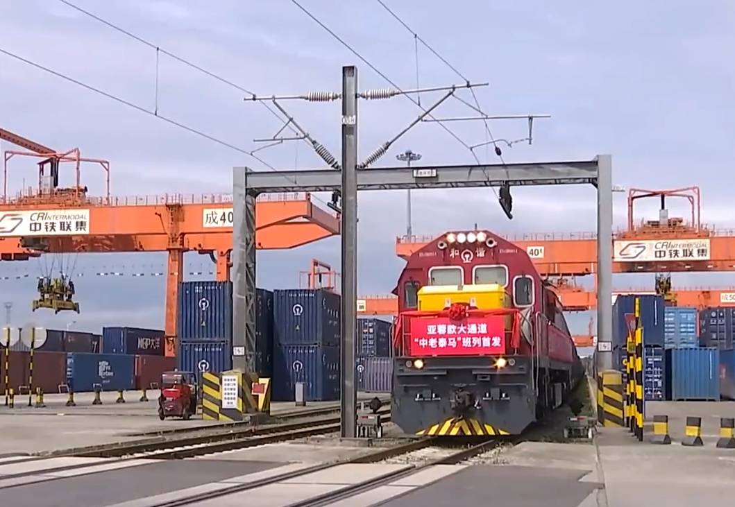 2024年4月30日,全国首列“中老泰马”全铁快速货运列车从四川成都国际铁路港发出。图据央视新闻
