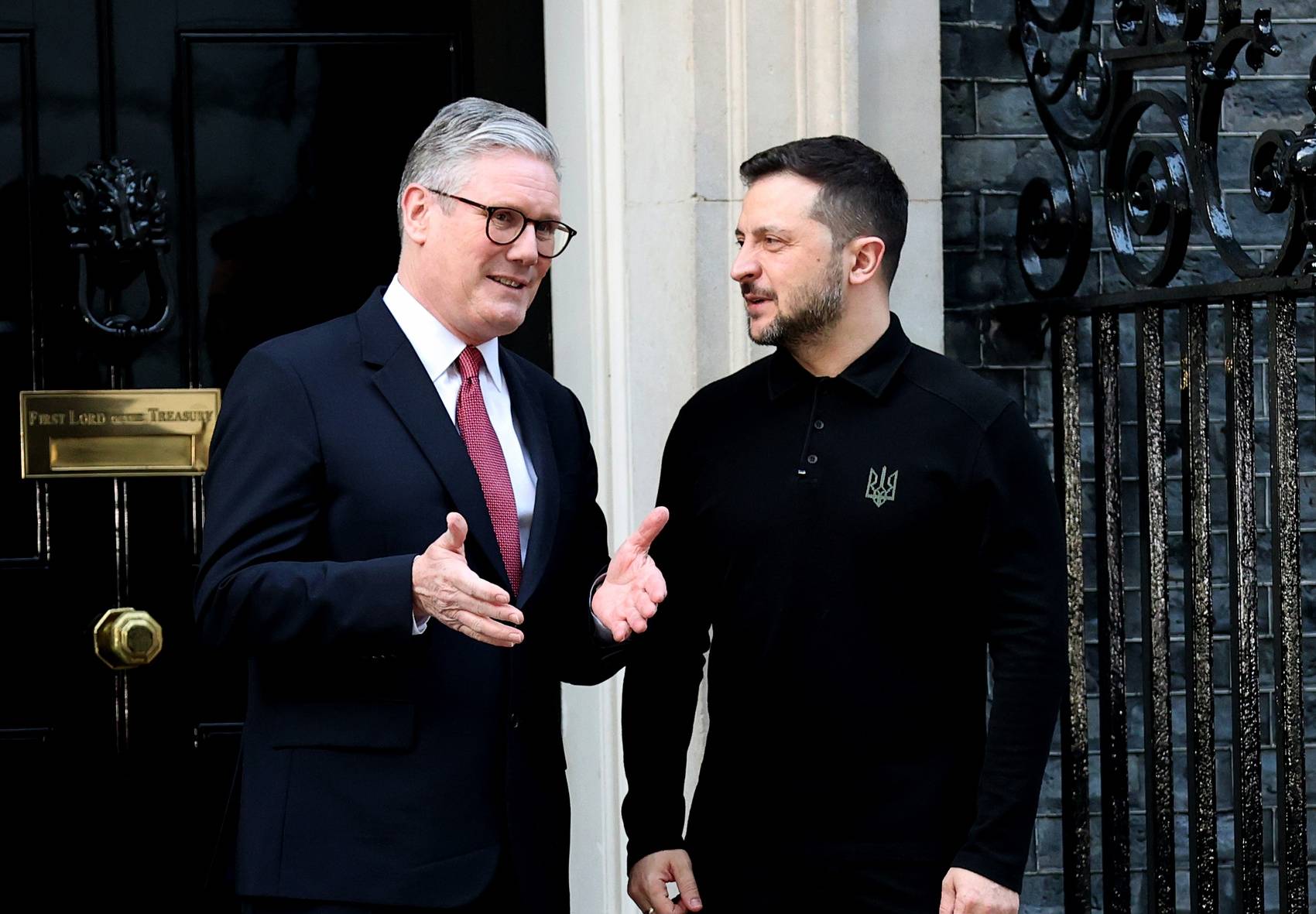 3月1日,在英国伦敦唐宁街10号首相府前,英国首相斯塔默(左)与乌克兰总统泽连斯基交谈。图据新华社