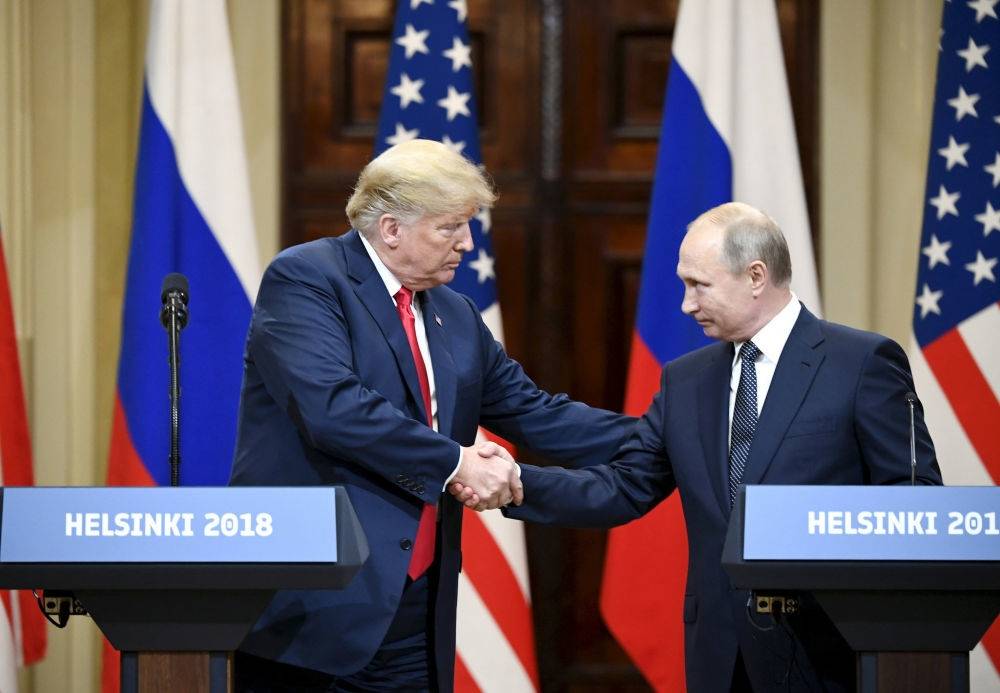 2018年7月16日,在芬兰首都赫尔辛基,美国总统特朗普(左)和俄罗斯总统普京出席联合记者会。(新华社发,尤西·努卡里 摄)