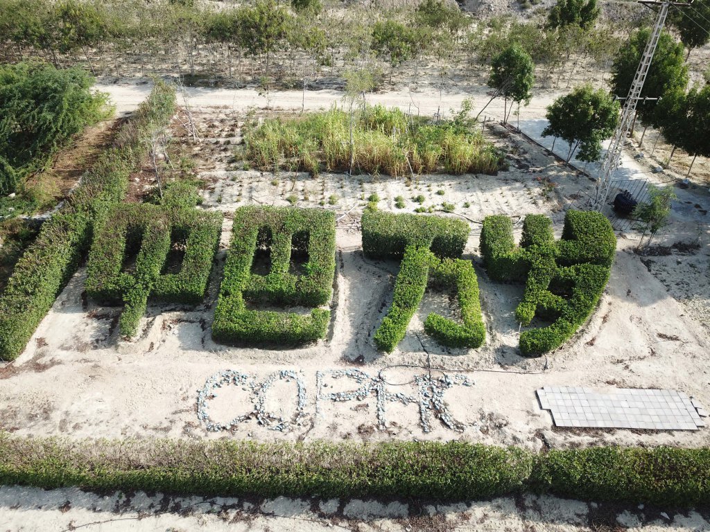 这是在巴基斯坦瓜达尔的中巴友谊林中拍摄的桤果木修剪而成的“中巴万岁”立体字(无人机照片,2024年9月15日摄)。新华社发(艾哈迈德·卡迈勒摄)