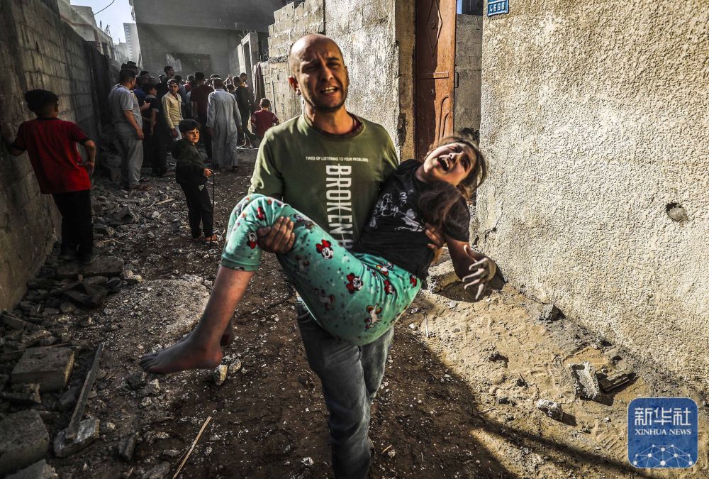 在以军空袭加沙地带北部杰巴利耶难民营所在区域后,一名男子抱着受伤的女孩寻求救援。