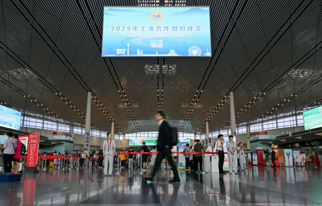 8月27日,在天津滨海国际机场T2航站楼,旅客经过2025年上海合作组织峰会宣传条幅。新华社记者 孙凡越 摄
