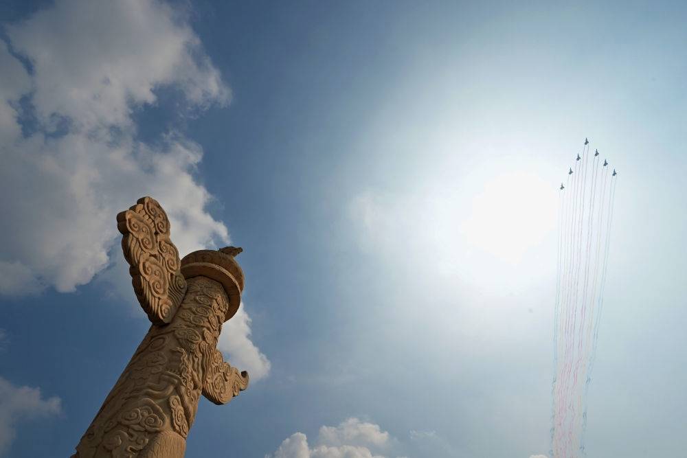 9月3日,纪念中国人民抗日战争暨世界反法西斯战争胜利80周年大会在北京隆重举行。这是教练机梯队接受检阅。新华社记者 陈晔华 摄