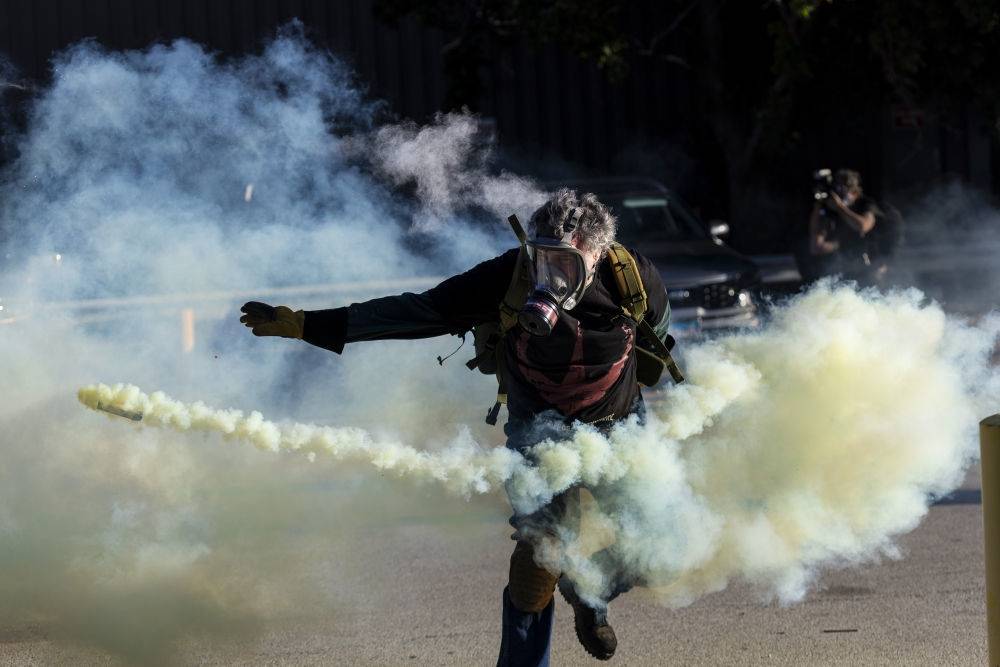 9月26日,在位于美国芝加哥西郊布罗德维尤市的移民与海关执法局办事机构外,抗议者在冲突中将执法人员发射的催泪弹瓶扔回。新华社发(文森特·约翰逊摄)