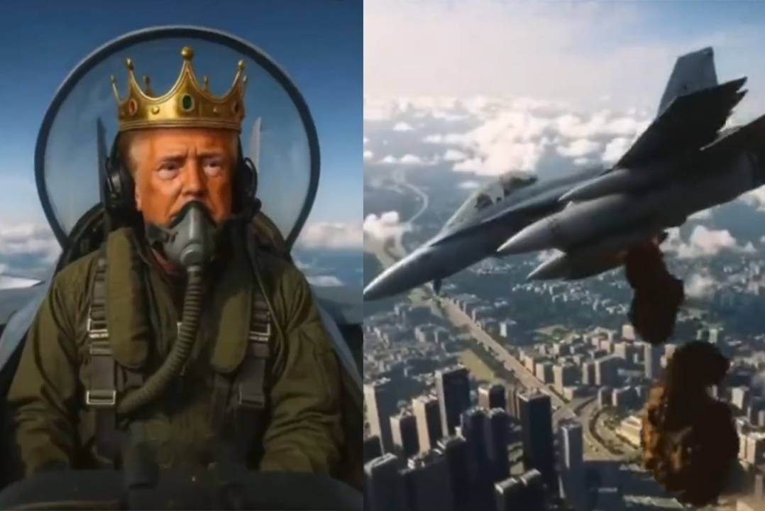 而另一边的“男主角”呢——特朗普本人正悠闲地在海湖庄园打高尔夫,不光这样,他还发了一段AI视频作为回应。视频里他头戴王冠、开着战机,朝抗议人群“扔泥巴”(也有媒体报道称是扔大粪)……那画面,有点“辣眼睛”。