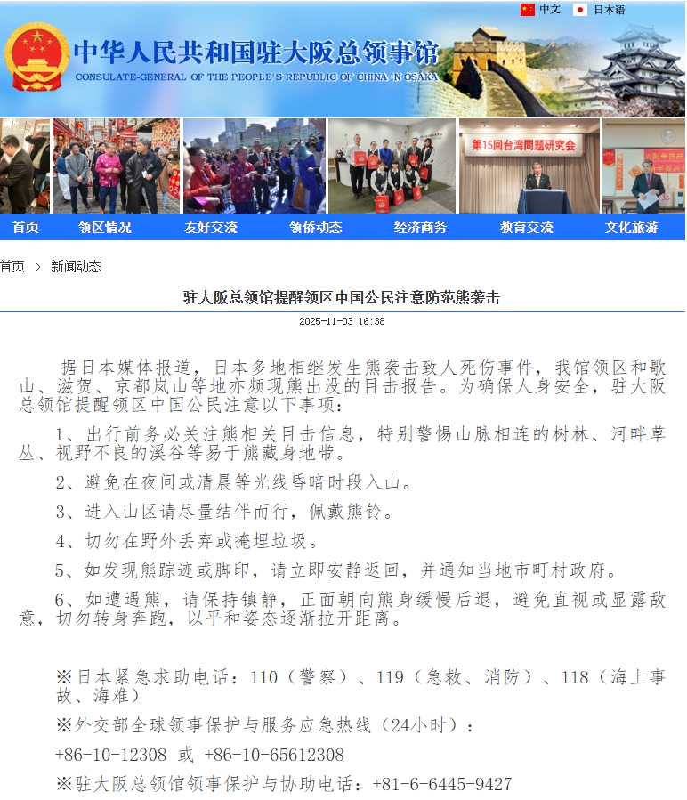 11月3日,我国驻大阪总领馆紧急发布提醒,呼吁在日及赴日公民“警惕熊袭击”!