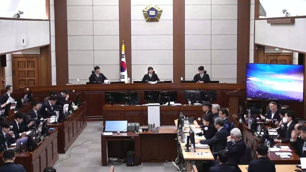 1月13日,韩国前总统尹锡悦(右侧电视机下方)在韩国首尔出席法院庭审。新华社/纽西斯通讯社