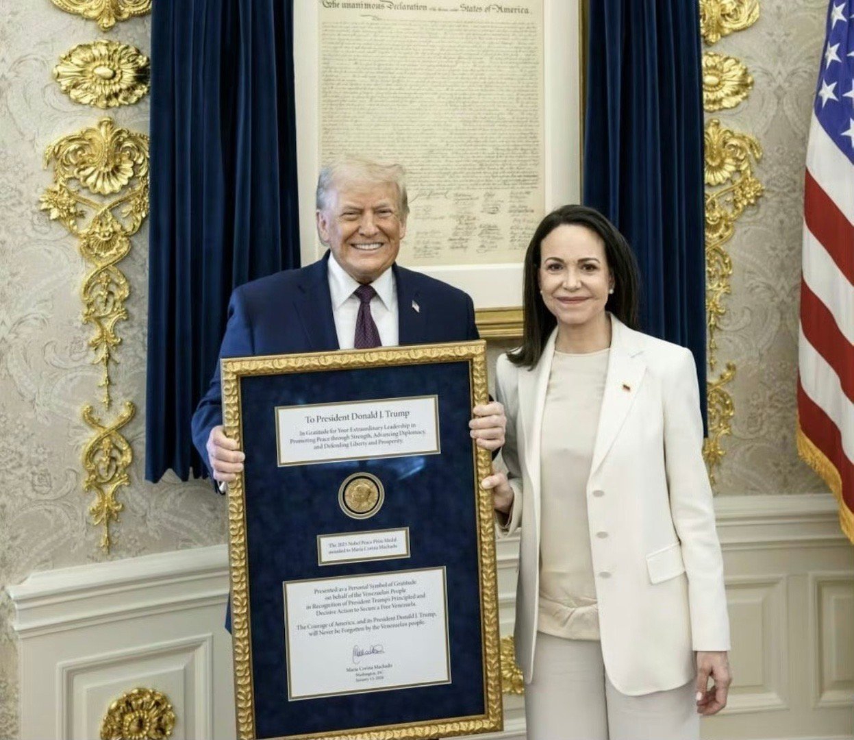 2025年诺贝尔和平奖奖章原本是颁给马查多的,不过1月15日会面时她转手给了特朗普,说是为了表彰他为委内瑞拉做的“贡献”。