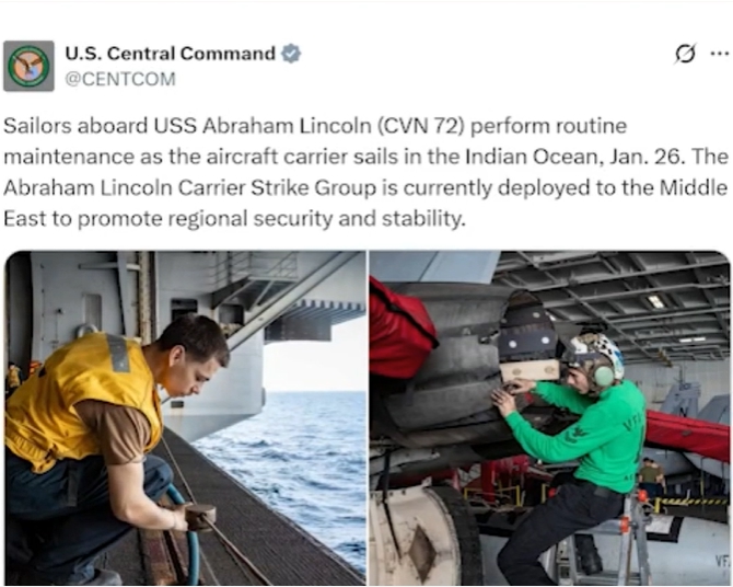 美军中央司令部发文表示,“林肯号”航母打击群“正部署到中东”。新华社视频截图