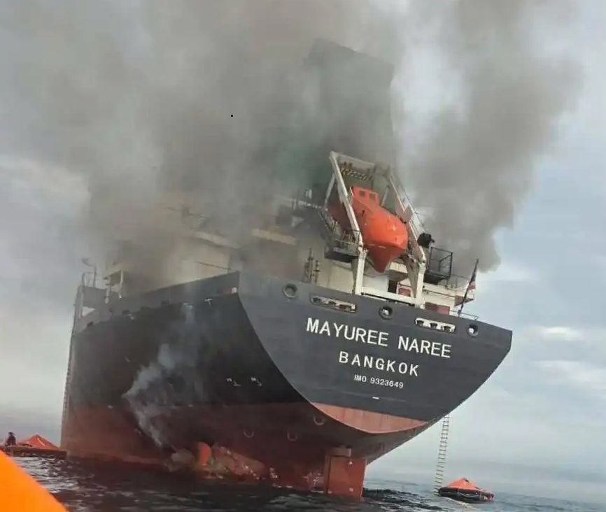 这张泰国海军2026年3月11日发布的照片显示,一艘泰国货船在霍尔木兹海峡海域遭袭起火。新华社发(泰国海军供图)