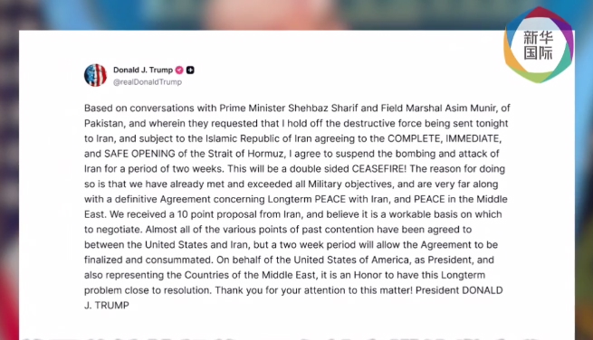特朗普发文宣布同意停火。