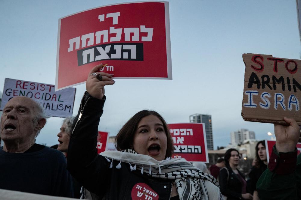 3月28日,在以色列特拉维夫一处广场,人们手持标语参加反战集会。新华社记者 陈君清 摄