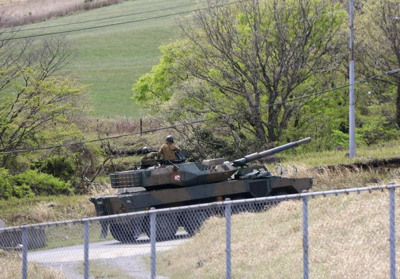 4月21日,军用车辆行驶在日本大分县陆上自卫队“日出生台演习场”。新华社/路透
