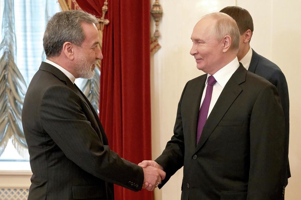4月27日,在俄罗斯圣彼得堡,俄罗斯总统普京(右)会见到访的伊朗外交部长阿拉格齐。新华社/卫星社