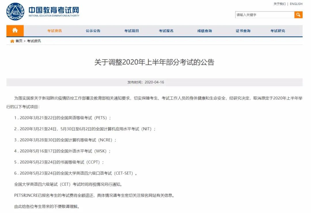 据中国教育考试网消息,为落实国家关于新冠肺炎疫情防控工作部署及教育部相关通知要求,切实保障考生、考试工作人员的身体健康和生命安全,经研究决定,取消原定于2020年上半年举行的以下考试项目: