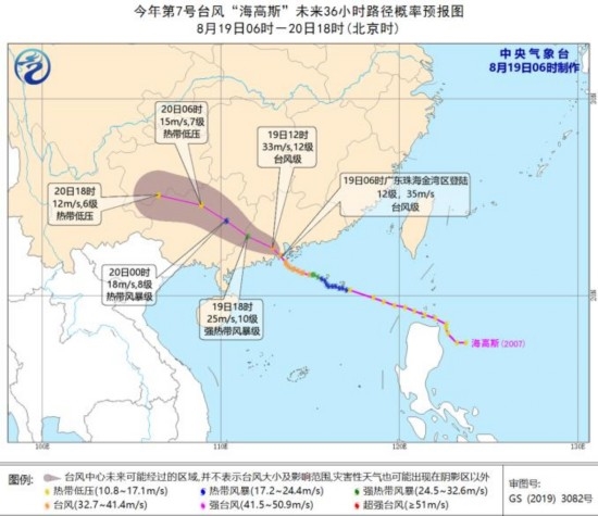中新网8月19日电 中央气象台8月19日6时继续发布台风橙色预警,今年第7号台风“海高斯”已于早晨6点钟前后在广东省珠海市金湾区沿海登陆,登陆时中心附近最大风力有12级(35米/秒),最低气压为970百帕,其中心位于北纬22.1度、东经113.3度,七级风圈半径150-200公里,十级风圈半径40公里,十二级风圈半径20公里。
