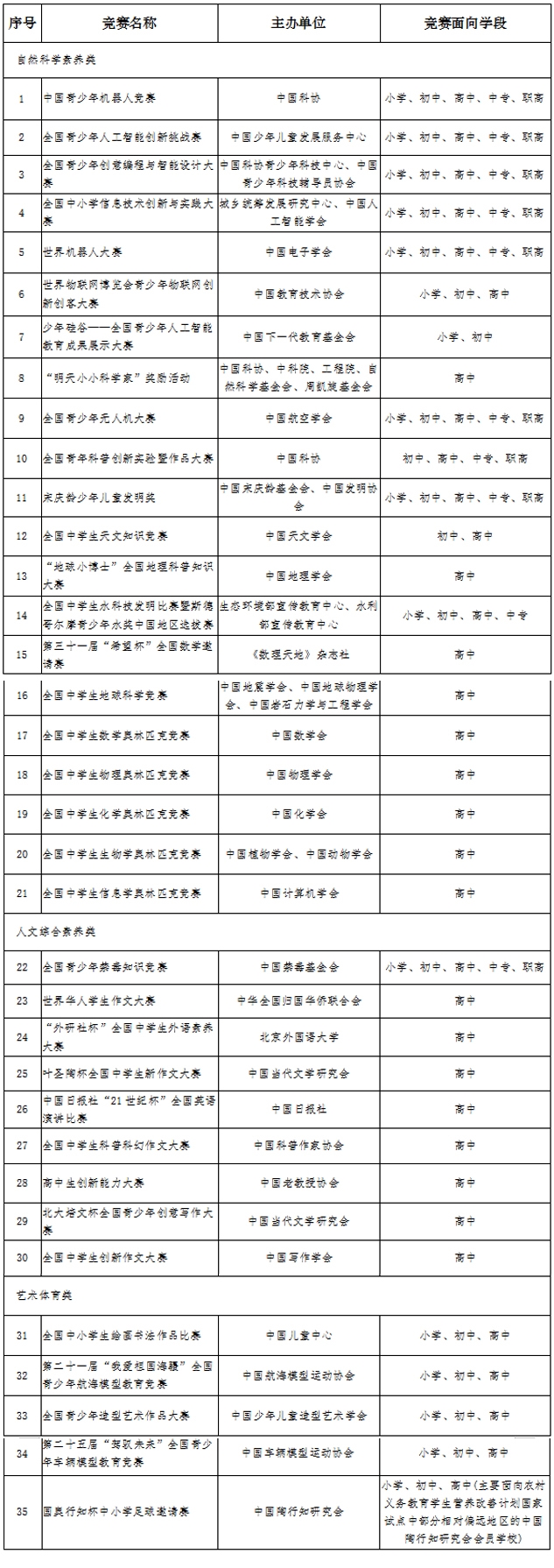 日前,教育部公布了2020-2021学年面向中小学生的全国性竞赛活动名单,名单分为“自然科学素养类”“人文综合素养类”“艺术体育类”三类,共有“中国青少年机器人竞赛”等35项竞赛进入名单。