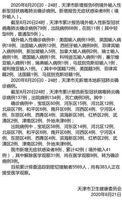据天津市卫生健康委员会官方微博消息,2020年8月20日0—24时,天津新增报告6例境外输入性新型冠状病毒肺炎确诊病例,新增报告无症状感染者8例(境外输入)。