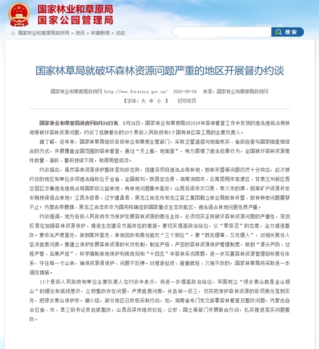 据国家林业和草原局政府网消息,8月24日,国家林业和草原局对2019年森林督查工作中发现的违法违规占用林地等破坏森林资源问题,约谈了挂牌督办的10个县级人民政府和1个国有林区森工局的主要负责人。