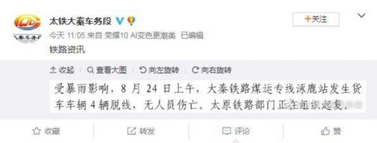 中新网8月24日电 据大秦车务段官方微博消息,受暴雨影响,8月24日上午,大秦铁路煤运专线涿鹿站发生货车车辆4辆脱线,无人员伤亡,太原铁路部门正在组织修复。