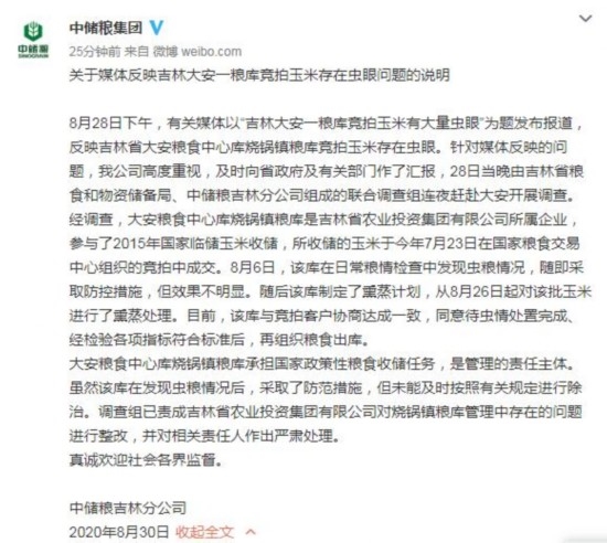 中新网8月30日电 据中国储备粮管理集团有限公司官方微博发布说明称,8月28日下午,有关媒体以“吉林大安一粮库竞拍玉米有大量虫眼”为题发布报道,反映吉林省大安粮食中心库烧锅镇粮库竞拍玉米存在虫眼。针对媒体反映的问题,中储粮高度重视,及时向省政府及有关部门作了汇报,28日当晚由吉林省粮食和物资储备局、中储粮吉林分公司组成的联合调查组连夜赶赴大安开展调查。