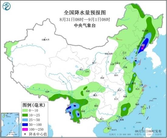 9月2日08时至3日08时,东北地区东部、四川盆地东部、贵州北部、云南东北部等地的部分地区有中到大雨,其中,吉林东部、贵州北部、云南东北部等地局地有暴雨(50~80毫米)。
