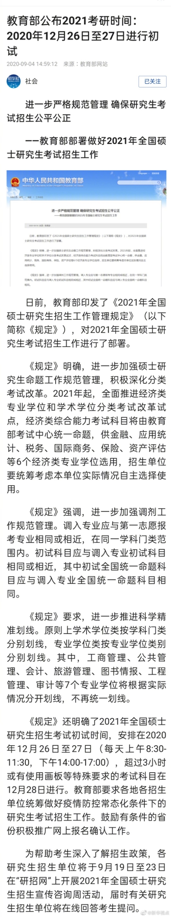 日前,教育部印发了《2021年全国硕士研究生招生工作管理规定》(以下简称《规定》),对2021年全国硕士研究生考试招生工作进行了部署。