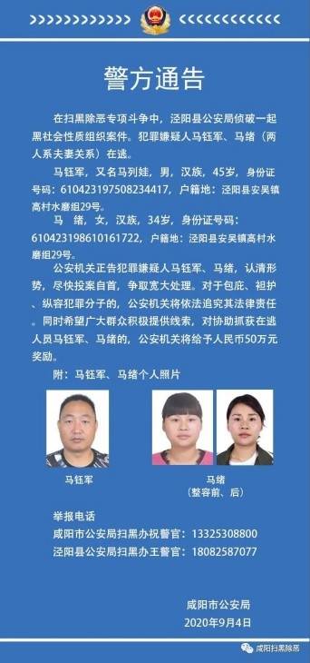 悬赏50万!陕西咸阳警方通缉涉黑在逃夫妻