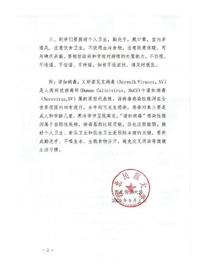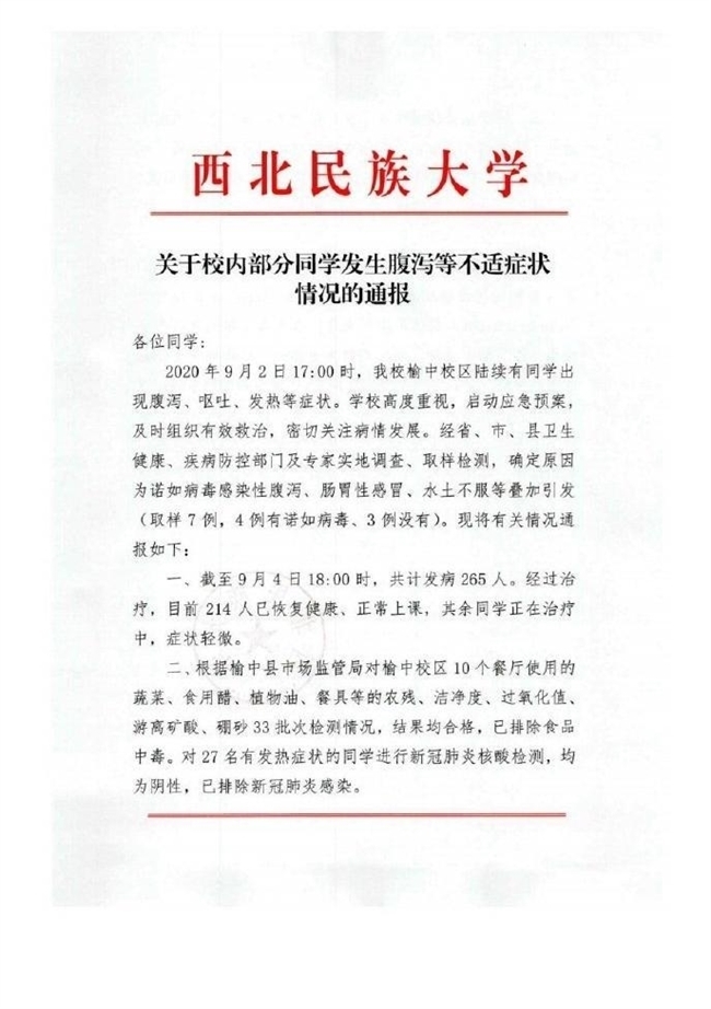 9月4日晚,西北民族大学官方微博发布“关于校内部分同学发生腹泻等不适症状情况的通报”称,截至9月4日18时,学校共计265名学生出现不适症状,已有214人恢复健康正常上课,其余同学症状轻微正在治疗。从9月2日开始,该校陆续有学生出现腹泻等症状,经多部门实地调查、取样检测,确定为诺如病毒感染性腹泻、肠胃性感冒、水土不服等叠加引发。
