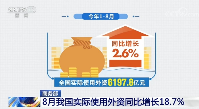 数据显示,今年1到8月,全国实际使用外资6197.8亿元,同比增长2.6%。8月当月,全国实际使用外资841.3亿元,同比增长18.7%。