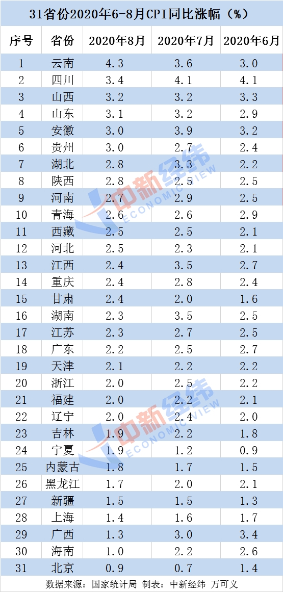 分省份来看,云南、四川、山西、山东等12省份8月份CPI同比涨幅超过全国水平,江西、重庆、甘肃等3地涨幅与全国持平,湖南、江苏、广东等16省份涨幅低于全国。其中,云南8月份CPI同比上涨4.3%,领涨全国;北京CPI同比上涨0.9%,涨幅全国最低。