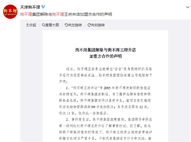 《声明》还表示,狗不理王府井店严重违反了狗不理集团企业品牌管理规定和与狗不理集团签订的加盟协议相关约定,严重损害了狗不理集团名誉,造成了极其恶劣的社会影响。