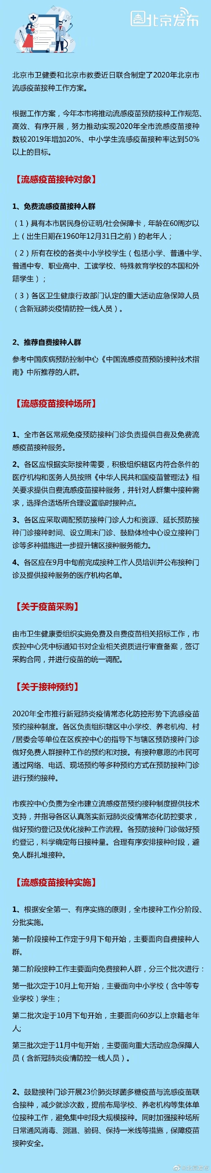 据北京市政府新闻办公室官方微博消息,2020年北京市流感疫苗接种工作方案已经制定,根据方案,具有北京市居民身份证明/社会保障卡的老年人,所有在校的各类中小学校学生,以及各区卫生健康行政部门认定的重大活动应急保障人员为免费流感疫苗接种人群。