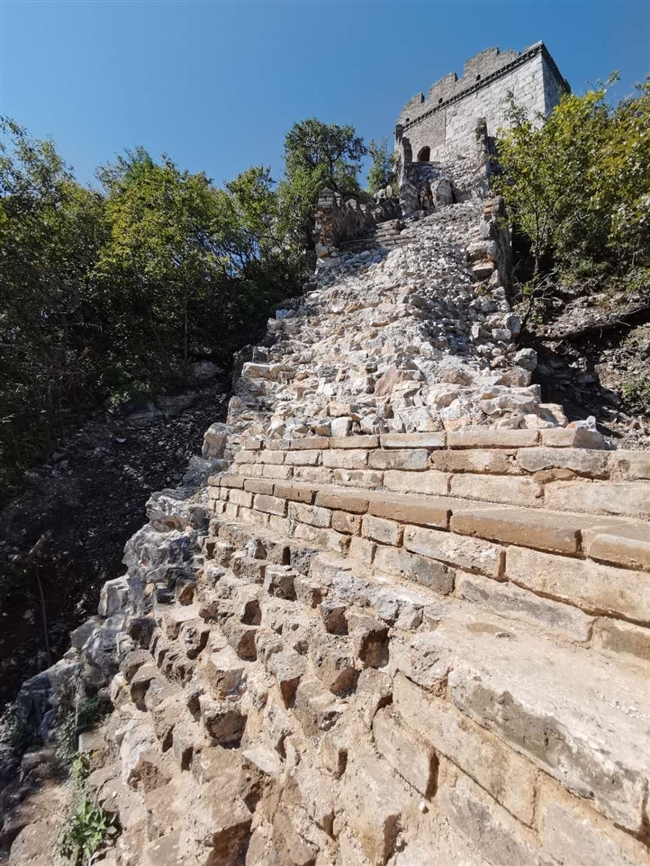 比如,箭扣三期多处台阶坍塌,露出了里面的毛石。此次按照三分之一归砌、三分之二原貌展示原则进行修缮。三分之一归砌旧砖,恢复台阶,保证通行;三分之二保留毛石面,但对毛石进行清理、加固。修缮后,既能看到长城最初的状态,也能看到岁月留下的痕迹,保留了“野”的味道。